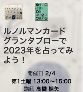 2/4(土)13:00〜池袋コミュニティ・カレッジ ルノルマンカード グランタブローで2023年を占ってみよう! 2022 12/01 講座・イベント ルノルマンカード 2022年12月1日 2022年12月1日 まったくはじめての方歓迎! 全員のグランタブローにコメントします。 参加者20名様限定のリアル講座です。 お申込はこちら 講座・イベント ルノルマンカード この記事が気に入ったら フォローしてね! Follow @kiriya_t Follow Me よかったらシェアしてね! URLをコピーしました! URLをコピーしました! 1/9(月・祝)13:00-15:00 ZOOMイベント 『今年もよろしく!コーヒーカード新年会2023』 2/8(水)18時半〜「はじめてのコーヒーカード占い」重版記念イベント コーヒーカード・バレンタインSP〜真実の恋を手に入れるための3枚〜 関連記事 2/14(土)11:00- リアルイベント『ルノまつり 〜はじめてのルノルマンカード占い♪ トリプルKと体験しよう〜』 2026年1月3日 1/28(水)19:00- ZOOMトークイベント 「毎日のカード占い 書き方 続け方」 2026年1月3日 1/12(月・祝)13:00-15:00 『新春恒例! コーヒーカードZOOM新年会2026』(リアルタイム視聴のみ) 2026年1月3日 12/6(土)、12/13(土)10:30〜『エレメンツルノルマン集中講座』 <全2回> 2025年11月21日 11/29(土)10:30- リアルイベント 54枚のルノルマンで楽しむ!『希望のゲーム大会と2026年の運勢』 2025年11月3日 10/18(土) 14:00〜「コーヒーカード占い基礎講座」実践1グランタブロー 2025年9月27日 9/21(日)10:30〜 ZOOM講座『高橋桐矢のジオマンシー実践テクニック講座』 2025年8月25日 8/23(土) 10:30〜ZOOM講座『高橋桐矢のアラビアンジオマンシーカード講座 2025年8月25日