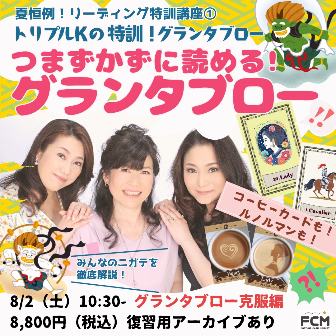 8/2(土) 10:30〜 特訓①『つまずかずに読めるグランタブロー』 グランタブロー克服編<復習用アーカイブ有> 2025 8/25 講座・イベント 2025年8月25日 2025年8月25日 日時:8月2日(土)午前10:30-12:30(2時間) 入室:10:00~ 講座料:8,800円(税込) 講師:トリプルK 講座・イベント この記事が気に入ったら フォローしてね! Follow @kiriya_t Follow Me よかったらシェアしてね! URLをコピーしました! URLをコピーしました! 7月26日 【天然石のジオマンシーネックレス&ブレスレット ワークショップ】 8/17(日) 10:30〜 特訓②『グランタブロー上級テクニック』 グランタブロー深読み編 関連記事 2/7(土)「心をケアする猫タロット占い」出版記念イベント〜占い師高橋桐矢と深める猫タロットDay 〜 2026年1月25日 2/14(土)11:00- リアルイベント『ルノまつり 〜はじめてのルノルマンカード占い♪ トリプルKと体験しよう〜』 2026年1月3日 1/28(水)19:00- ZOOMトークイベント 「毎日のカード占い 書き方 続け方」 2026年1月3日 1/12(月・祝)13:00-15:00 『新春恒例! コーヒーカードZOOM新年会2026』(リアルタイム視聴のみ) 2026年1月3日 12/6(土)、12/13(土)10:30〜『エレメンツルノルマン集中講座』 <全2回> 2025年11月21日 11/29(土)10:30- リアルイベント 54枚のルノルマンで楽しむ!『希望のゲーム大会と2026年の運勢』 2025年11月3日 10/18(土) 14:00〜「コーヒーカード占い基礎講座」実践1グランタブロー 2025年9月27日 9/21(日)10:30〜 ZOOM講座『高橋桐矢のジオマンシー実践テクニック講座』 2025年8月25日