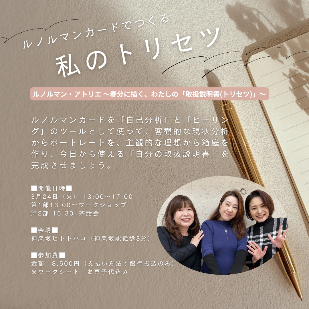 ルノルマンカードを「自己分析」と「ヒーリング」のツールとして使って、客観的な現状分析からポートレートを、主観的な理想から箱庭を作り、今日から使える「自分の取扱説明書」を完成させましょう。